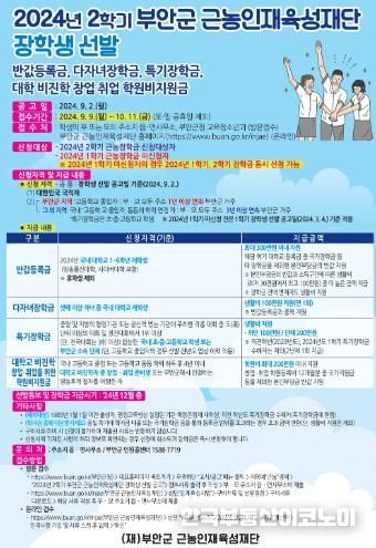 한국부동산이코노미 도경수 기자 | 부안군 근농인재육성재단은 2024년 2학기 장학생 신청 접수를 위해 각종 홍보자료를 준비하고 온라인 접수 시스템을 정비하는 등 장학금 지급 준비를 모두 마쳤다고 전했다.
