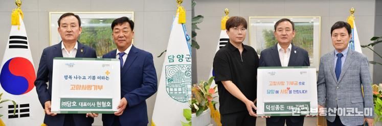 담양군은 담양군 금성면에 자리한 신재생에너지 전문기업인 ㈜담호의 현형호 대표이사와 금성면에서 양돈업을 운영하는 덕성종돈영농조합법인 강병구 대표가 기부금을 기탁하며 담양 지역발전에 힘을 보탰다고 4일 전했다.