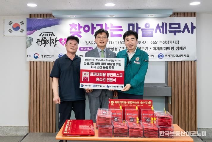 부산지방세무사회는 화재 시 연기흡입을 막아주는 방연마스크 숨수건 150장을 부전상가시장 신영욱상인회장에게 전달했으며 추석을 맞아 장을 보러 온 시민들에게 장바구니 200개를 나눠 주었다.