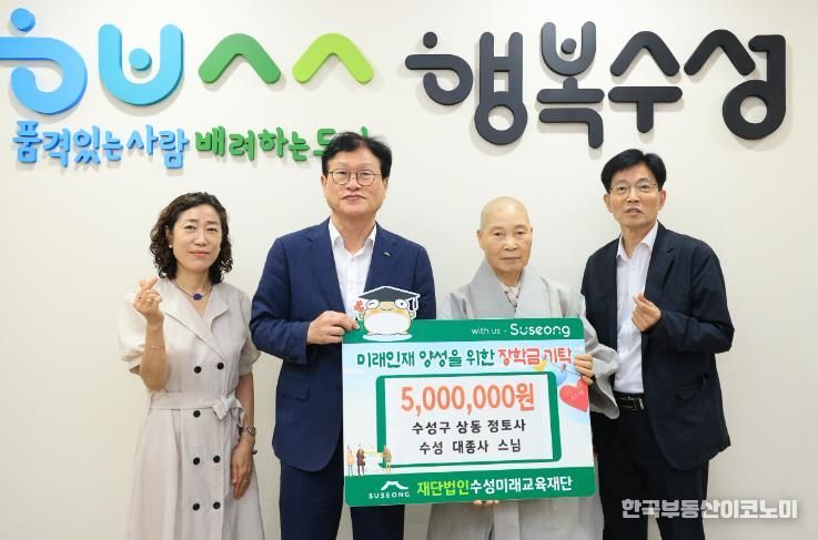 한국부동산이코노미 도경수 기자 | 대구 정토사 회주 수성 스님은 지난 13일 미래인재 육성과 지역 교육발전을 위한 장학금 5백만원을 (재)수성미래교육재단에 기탁했다.