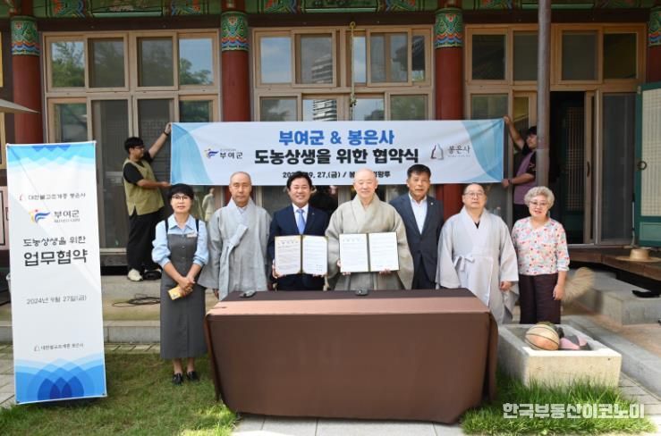 한국부동산이코노미 도경수 기자 | 부여군은 27일 서울 강남 한가운데 자리하고 있는 봉은사 법왕루에서 굿뜨래 농특산물 직거래 확대를 위한 도농 상생 업무협약을 체결했다고 밝혔다.