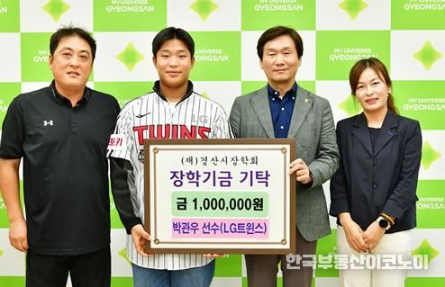 한국부동산이코노미 도경수 기자 | 경산시 리틀야구단 출신 박관우 프로야구 선수가 자신의 선수 생활에 발판을 마련해 준 경산시를 찾아 장학금을 기탁했다.