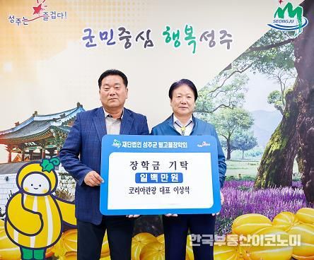 코리아관광은 성주읍에 위치한 국내외 여행업체로 성주군 인재양성에 도움이 되고자 장학금 1백만원을 기탁하게 되었다고 밝혔다.