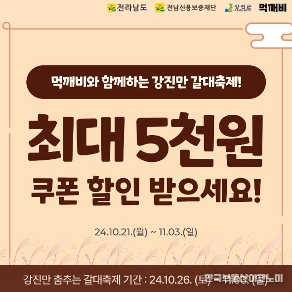 한국부동산이코노미 도경수 기자 | 강진군이 10월 21일 월요일부터 11월 3일 일요일까지 공공배달앱 ‘먹깨비’로 주문 시 평일과 주말 모두 최대 5천 원 할인 쿠폰을 지급하는 특별 이벤트를 추진한다.