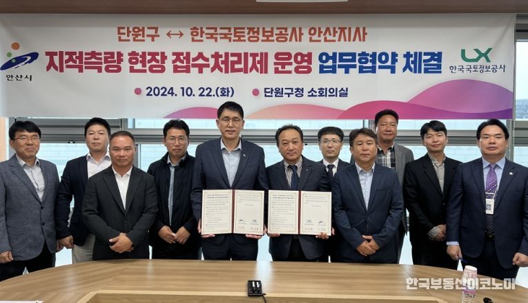 한국부동산이코노미 도경수 기자 | 안산시 단원구는 지난 22일 단원구청 소회의실에서 한국국토정보공사 안산지사와 지적측량 현장 접수처리제 운영을 위한 업무 협약을 체결했다고 23일 밝혔다.