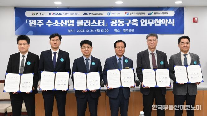 한국부동산이코노미 도경수 기자 | 수소 산업을 선도하고 있는 완주군이 수소 기업 지원책 마련을 위해 중소벤처기업진흥공단, 한국수소연합, 한국가스안전공사, 전북테크노파크, 완주수소연구원과 ‘완주 수소산업 클러스터’ 공동 구축을 위한 업무협약을 체결했다.