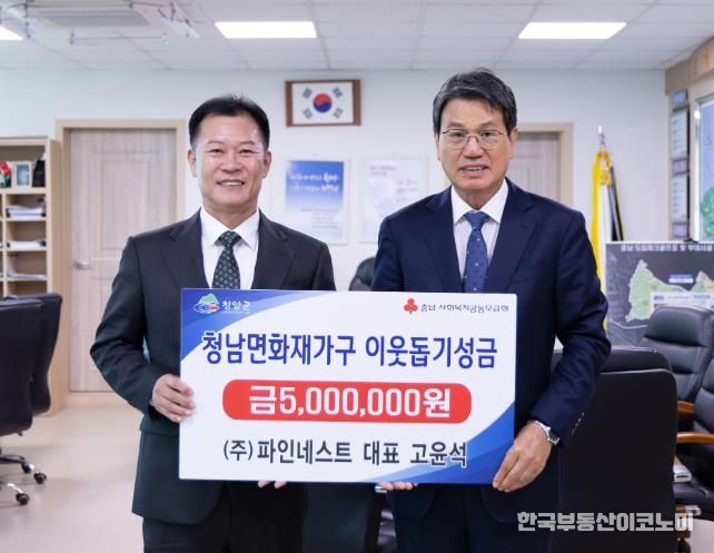 한국부동산이코노미 도경수 기자 | 청양군은 지난 24일 ㈜파인네스트 고윤석 대표가 군을 방문해 청남면 화재 주민에게 전달해 달라며 5백만원을 기탁했다고 전했다.