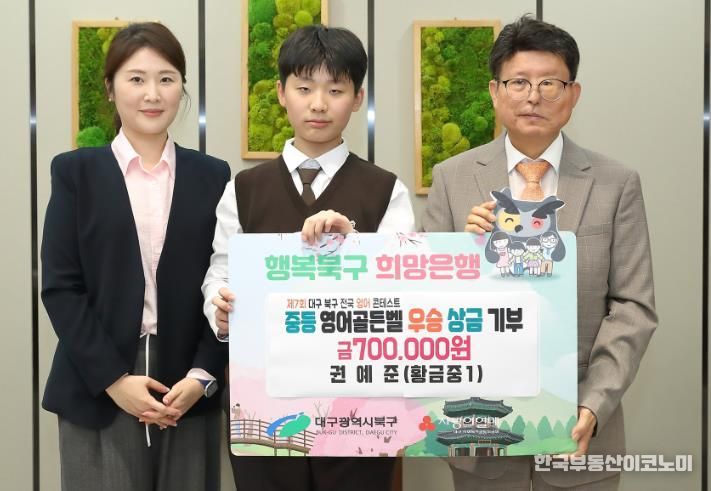 한국부동산이코노미 도경수 기자 | 대구 북구청 주관으로 지난 10월 19일 대구일중학교에서 개최된 '제7회 대구 북구 전국영어콘테스트 대회'에서 중등 영어골든벨 부문 대상수상자 권예준 학생(황금중 1)이 10월 29일 상금 전액(70만원)을 북구청에 전달했다.