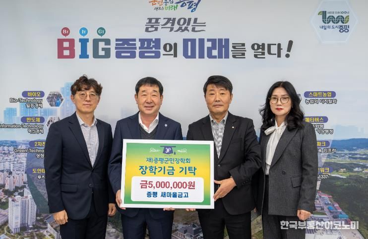 한국부동산이코노미 도경수 기자 | 증평 새마을금고는 30일 군청을 찾아 지역인재 양성을 위해 써달라며 (재)증평군민장학회에 장학금 500만원을 기탁했다.