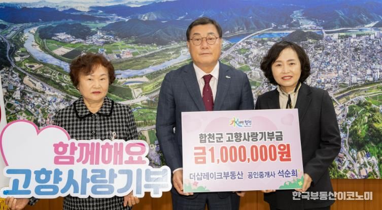 한국부동산이코노미 도경수 기자 | 합천군은 지난 31일, 창원시 소재 더샵레이크부동산 석순희 대표가 고향사랑기부금 100만원을 기탁했다고 밝혔다.