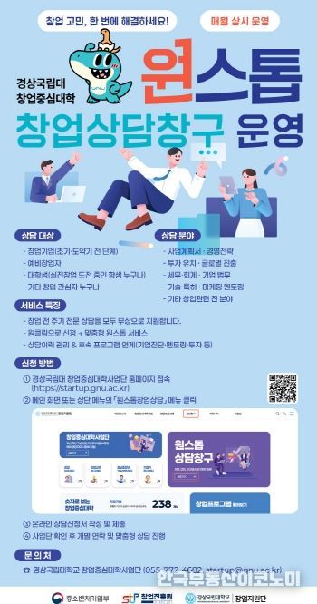 한국부동산이코노미 도경수 기자 | 경상국립대학교 창업중심대학사업단(단장 최병근)은 최근 사업단 누리집의 ‘원스톱 창업상담창구’를 대폭 개편하고, 지역 창업기업과 예비창업자들이 쉽게 상담 서비스를 이용하도록 온라인 접근성을 대폭 강화했다고 밝혔다.