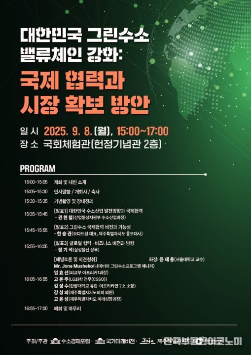 국회 수소경제포럼과 국회 국가미래비전포럼, 제주도는 8일 오후 3시 국회체험관(헌정기념관 2층)에서 ‘대한민국 그린수소 밸류체인 강화를 위한 정책토론회’를 공동 개최한다.