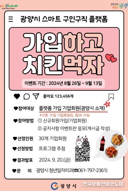 한국부동산이코노미 도경수 기자 | 광양시는 관내 모든 공공, 민간 일자리 정보를 한눈에 볼 수 있는 일자리 종합 플랫폼인 ‘스마트 구인구직 플랫폼’ 활성화를 위해 기업회원을 대상으로'가입하고 치킨먹자!'이벤트를 진행한다고 밝혔다.
