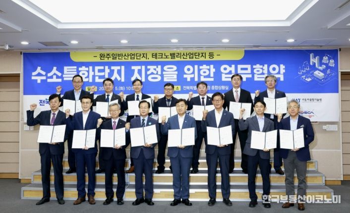 5일 완주군 전북도청 종합상황실에서 ‘전북 완주 수소특화단지 지정·육성을 위한 업무협약’을 체결하고, 산업통상자원부의 수소특화단지 지정 공모에 공동 대응하기 위한 협력체계 구축에 뜻을 모았다.